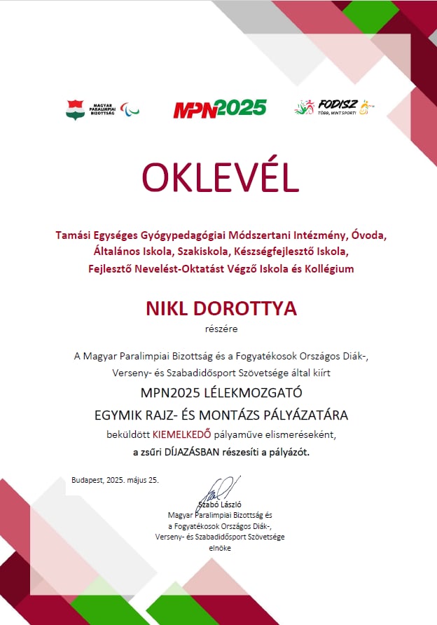 Nikl Dorottya, 9. osztályos szakiskolai tanulónk, a Magyar Paralimpiai Bizottság és a FODISZ által kiírt Lélekmozgató EGYMIK rajz- és montázspályázatra beküldött KIEMELKEDŐ pályaművéért, a zsűri díjazásban részesítette. Gratulálunk, Dorka! (felkészítő tanár: Kömüvesné Palásti Anett)